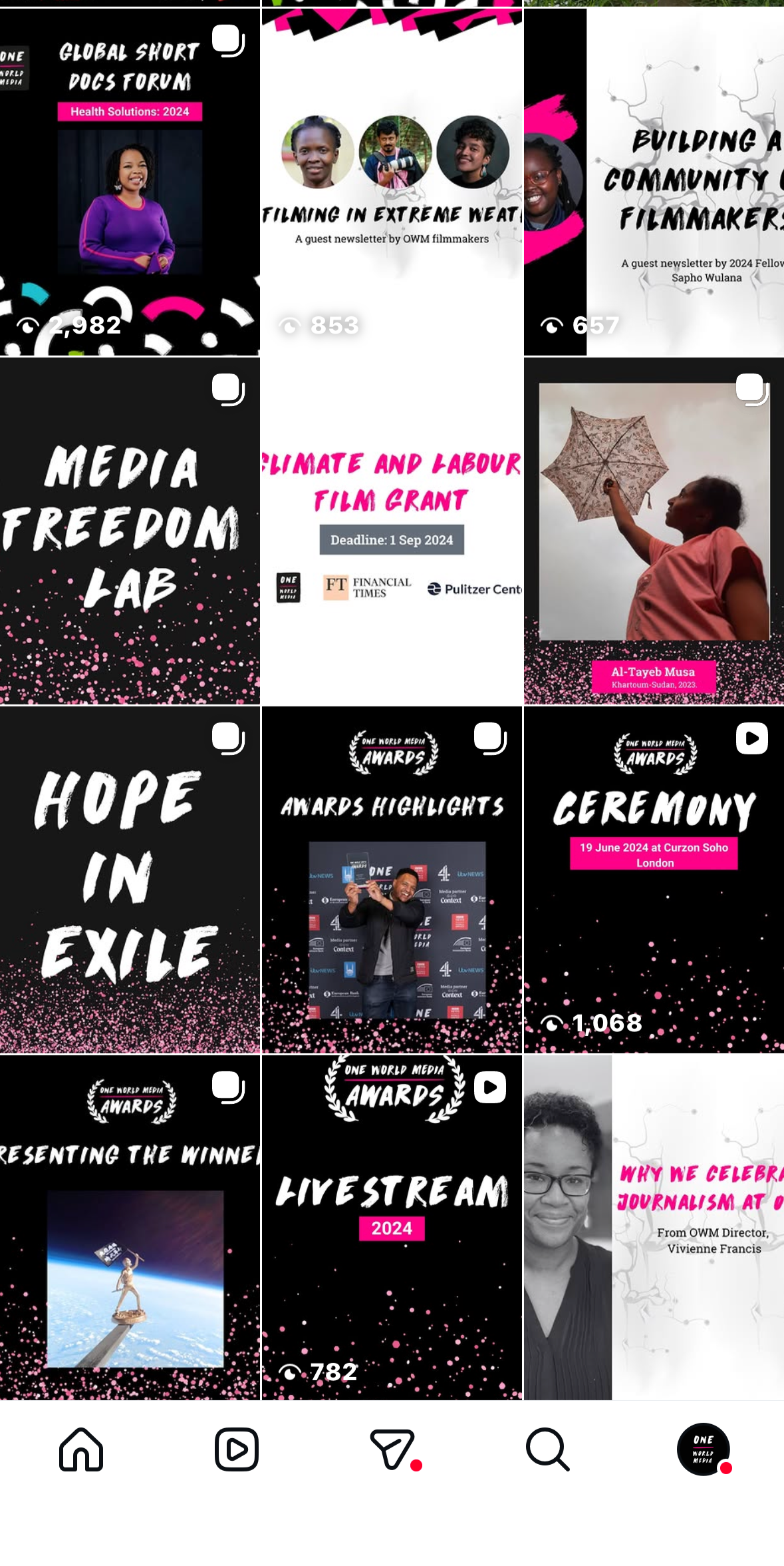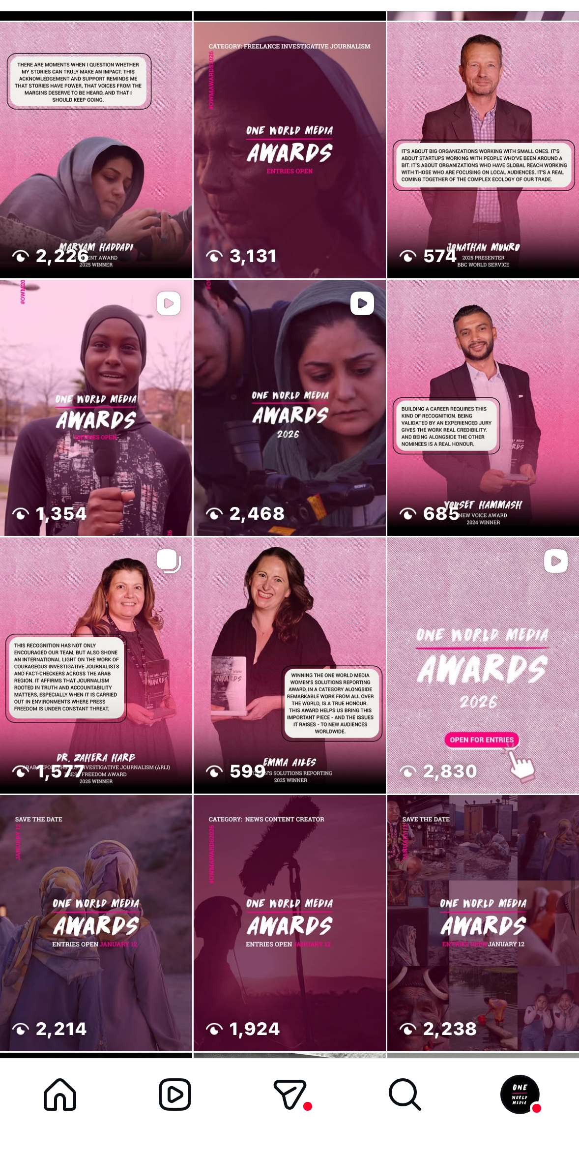 On joining One World Media I audited the organisation's social media presence and identified an opportunity to shift from static, graphic-led content to a video-first approach centring the voices of journalists themselves. I restructured the content strategy across Instagram and YouTube, introduced a series-led format featuring award winners and nominees, and moved to short-form vertical video as the primary format.